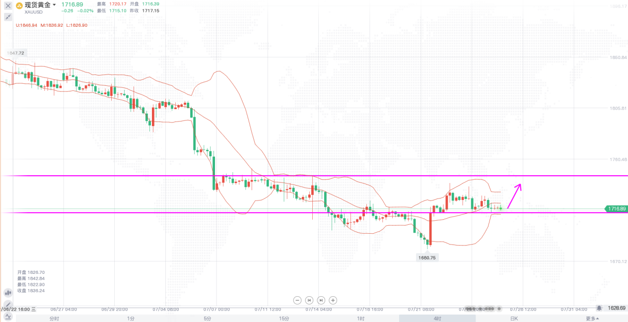 昨日黄金整体波幅不大,价格围绕1720上下震荡,全球经济衰退预期、地缘局势紧张、美债收益率下降,给黄金提供了一些支撑,但美元守住布林线中轨后反弹,令价格承压。市场目前都在等待美盘时段的美联储利率决议,预期美联储将加息75个基点,有数据显示加息100个基点的概率仅为24%,需重点关注利率决议的鹰鸽倾向,如果美联储主席鲍威尔可能为9月份加息50个基点或者75个基点做好铺垫,黄金短线仍有进一步下行风险,但还需留意美联储对经济衰退的观点和态度,若多次提出经济衰退,则有望给金价提供探底回升的机会。