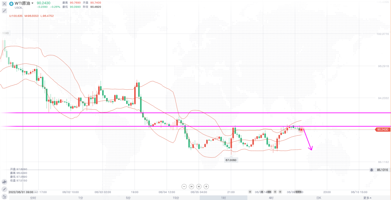 原油价格昨日虽然迎来了一波反弹,但很明显的可以看见,价格并没有突破关键的阻力位置。日线级别,布林带开口向下,价格在87一线暂时企稳,但昨日价格的反弹并没有破位走出新高点,整体走势还是震荡偏空。4小时,布林带走平,价格在低位形成横盘整理态势,保持87-91区间震荡,日内短线上方90.5-91.5区域阻力不破,价格还有继续走低的风险,操作思路上尽量以反弹高空为主。