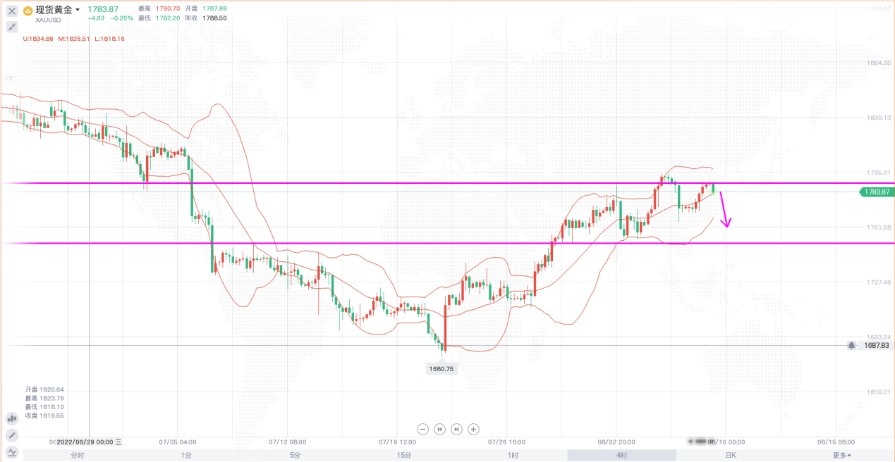黄金价格近几日没有太大的波动,价格围绕着1780上下波动,形成横盘震荡走势,上方1800关口阻力强劲,短线上破有点难度。日线级别,布林带开口,价格在上轨附近横盘整理,价格的这波反弹暂时在这个位置附近滞涨,市场对9月加息预期的升温在一定程度上限制了价格的上涨,同时周三有通胀数据出炉,预期数据公布之前价格波动不会太大。4小时,布林带收口,价格冲高回落,在1890一线形成了头肩顶的形态,短线价格有回调迹象,日内操作思路上先看一波回落,上方关注1795-1800区域阻力。