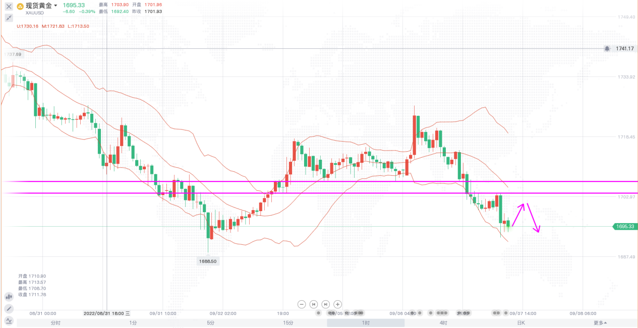 黄金价格近期走势相对原油来说比较明朗,大的方向始终保持着震荡偏空的走势,虽然昨日小幅反弹,但反弹力度较弱,并未到达预期的位置就开始下跌。日线级别,布林带开口向下,价格反弹至1726附近后承压转跌,回吐近两日涨幅,日线收上影线较长的阴线,早间开盘,价格延续昨日跌势,快速下跌试探1690附近支撑,短线走势偏空。1小时,价格走势比较明显,在反弹至1704-1706这一顶底转换区域后遇阻下跌,而日内的关注点也在于此,只要价格没站上这个位置,短线空头的思路就不改变,操作上以反弹高空为主,如果上破,到时候再反手做多也不迟,重点关注1704-1706这一多空分界线的位置。