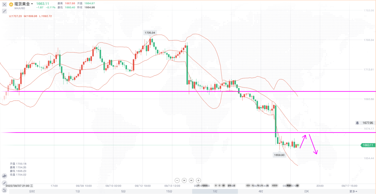 黄金价格在经历近半月的震荡之后,昨日在数据的影响下,选择了向下破位,价格在跌破1680一线强支撑后,快速下跌,最低触及1660一线。日线级别,布林带开口向下,价格多次在中轨附近反弹无力,按照预期延续了下跌走势,之前也强调过,1680一线不是底,很有可能守不住,在美联储激进加息的预期下,下破已经很明显的事情。1小时,布林带开口向下,价格在触及到中轨后一根大阴线直接下跌至1660附近,而后形成低位的横盘走势,弱势格局明朗,价格在大幅下跌之后并没有太多的反弹,最高反弹至1670附近,这也是日内所需要关注的阻力位置,短线操作思路上反弹做空即可。
