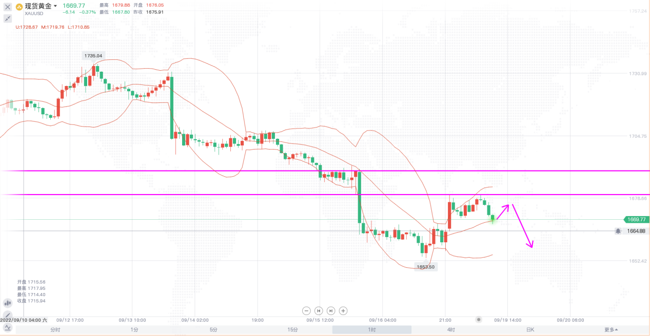 黄金价格上周终究是未能坚守住1680这一重要支撑位置,价格在横盘正当近两周后形成了破位,当然这也在预料之中,一直也在强调1680不是底,抄底还尚未到时机。日线级别,布林带开口向下,价格在反弹至中轨附近遇阻后,走出三连阴局面,虽然价格在周五走了一波反弹,但未能站上1680这一顶底转换位置,短线价格还将在1680下方保持空头走势。1小时,价格在两次触及到1680阻力后回撤,形成双顶形态,早间开盘价格持续下跌,整体走势偏弱,日内操作思路上继续看空,下方关注1650附近支撑。