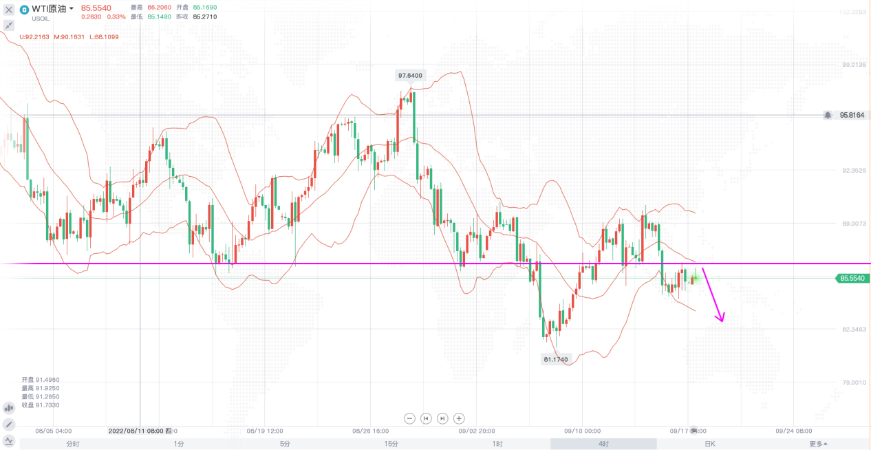 原油近两周走势整体波动不大,价格维持在90美元关口下方形成震荡,中途几次有过几次反弹,但都未能站上90美元关口。日线级别,布林带开口向下,价格的几次反弹均受到布林中轨的压制,反弹效果甚微,整体走势偏弱,只要价格没突破布林中轨附近阻力,短线价格反弹无望。4小时,布林带开口向下,价格在中轨和下轨之间形成震荡,早间开盘价格冲高回落,上方阻力强劲,短线走势还是以空头为主,日内需关注上方86.5附近阻力,操作上以反弹高空为主。