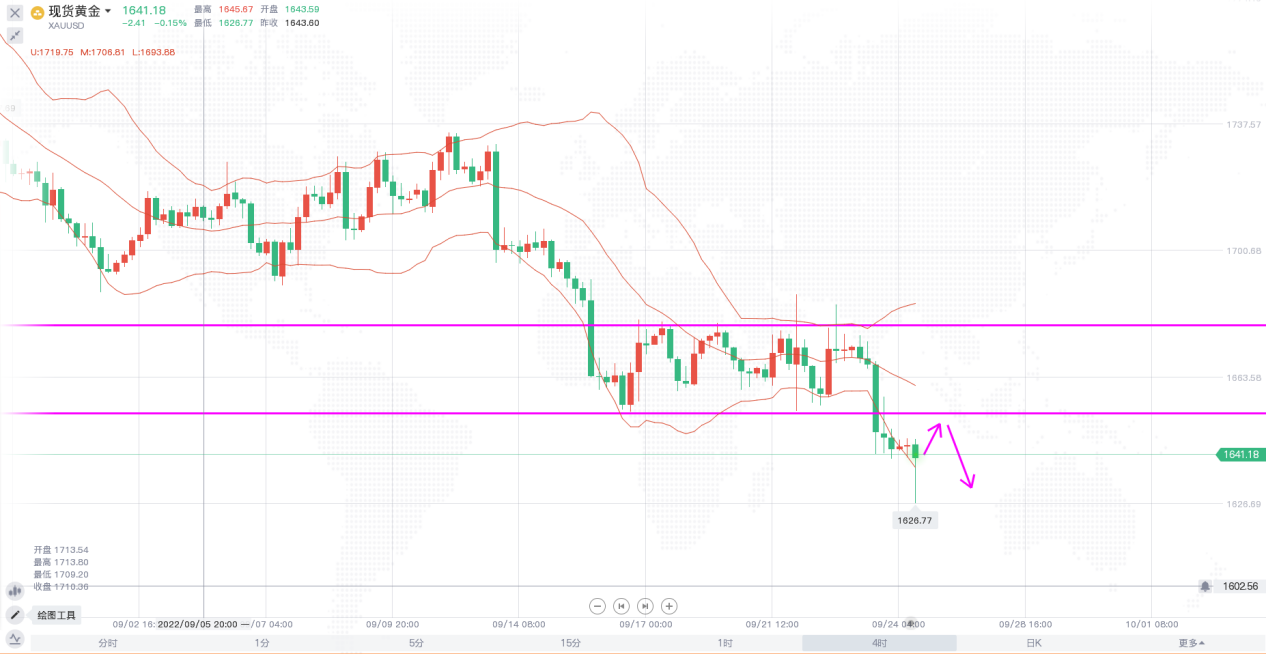 黄金价格近期走势整体偏弱,上周低位震荡一周后周五选择向下破位,并形成快速的下跌,大的方向比较明朗。日线级别,布林带开口向下,价格跌破下轨一线支撑,早间开盘价格延续下跌快速下探1626一线,日内有继续走低的风险。4小时,布林带开口向下,价格跌破震荡区间下限,沿着下轨震荡下行,短线价格没有太多的反弹,整体走势还是震荡偏空,在美元指数持续走高的情况下,短线价格试探1600关口也是有可能的,日内操作上尽量以反弹高空为主,上方关注1653附近阻力。