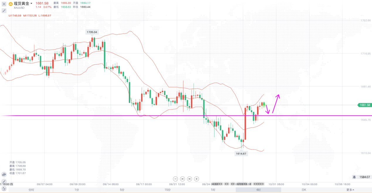 黄金价格昨日第三天收得阳线,价格在低位暂时企稳走出了一波反弹的行情,但这并不意味着趋势得到扭转,短线的反弹还要看价格能不能得到延续。日线级别,布林带有收口迹象,价格在1615附近受到支撑止住跌势,之前也文章中也说过,价格的这波反弹有试探布林中轨一线的需求,早间开盘价格延续上涨走势,日内价格有望进一步走高。4小时,布林带开口向上,昨日美盘价格回踩布林中轨后上涨,短线走势震荡偏多,日内操作思路上继续看多,下方关注1650-1652区域支撑。