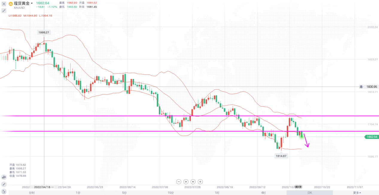 黄金上周四周五高位冲高回落,大幅度下跌,黄金短线弱势有望延续,黄金早盘反弹还是继续先顺势空,然后黄金可能开始进入长时间的震荡周...