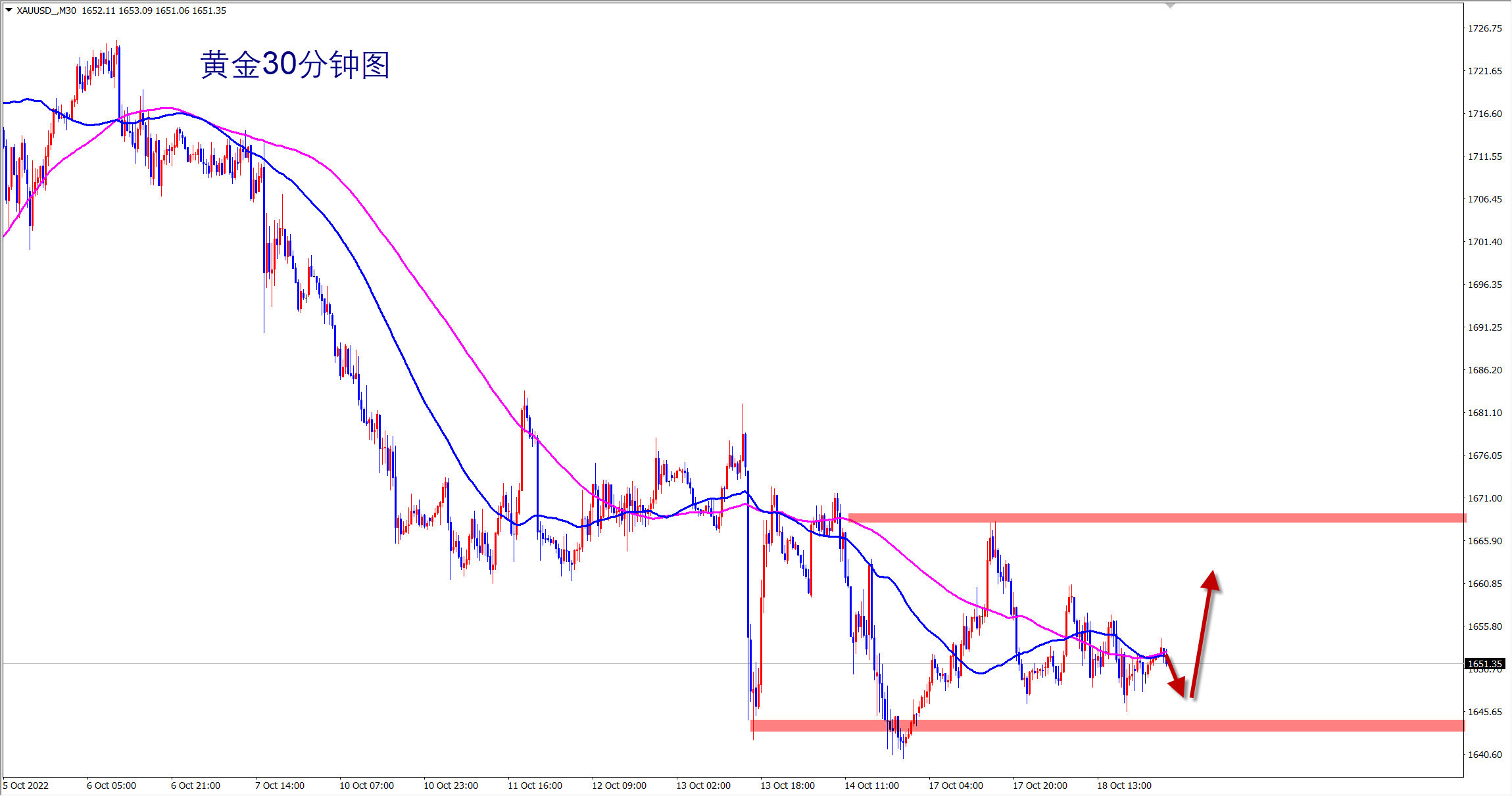 黄金大涨大跌后容易陷入震荡行情,现在就是如此!压力位置明显,支撑位置也已经画出,除非行情破位,不破不立,在此之前,依旧是震荡对待!