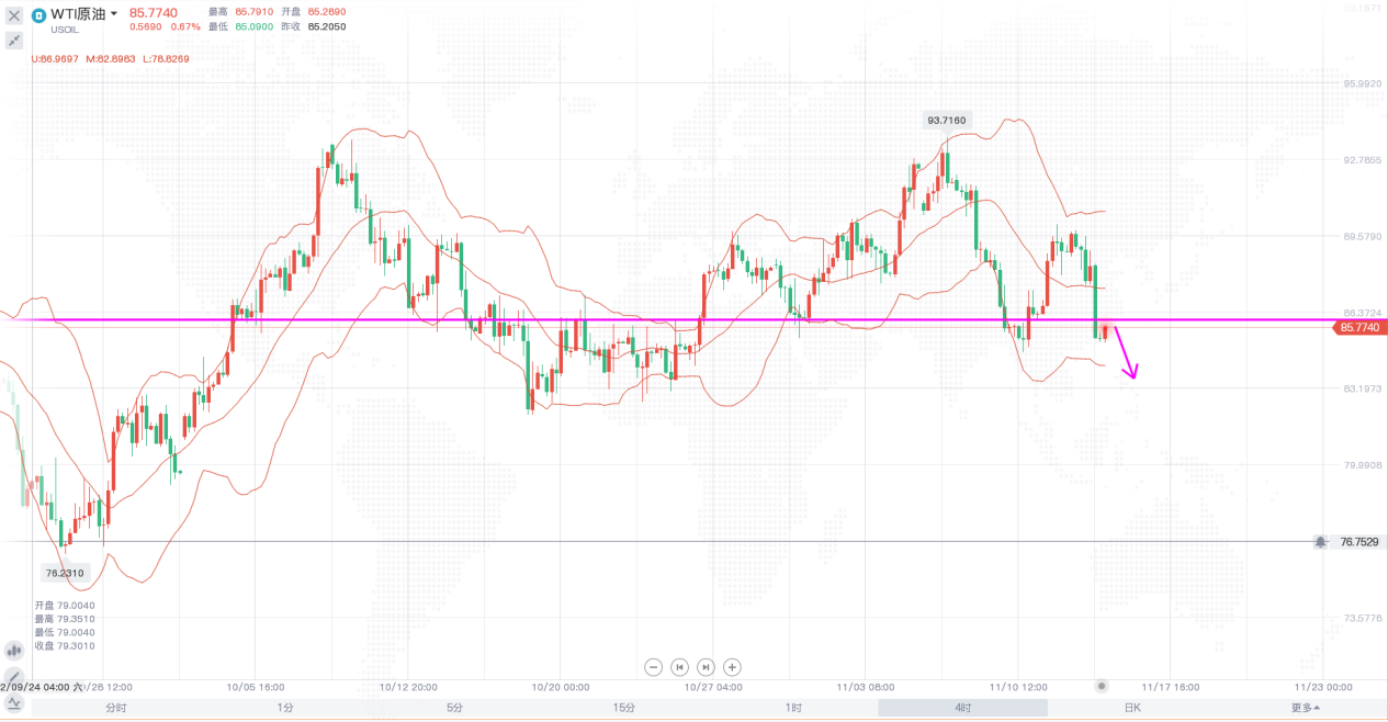 原油价格近期走势比较焦灼,多空双方势均力敌,价格维持在低位宽幅震荡。日线级别,布林带收口走平,价格围绕着中轨震荡,整个走势方向并不是很明朗,短线价格缺少向上的动力,早间开盘价格保持在低点盘整,预期日内将延续昨日跌势。4小时,布林带开口向下,价格在跌破中轨支撑后快速下跌,走势偏弱,日内操作思路上以反弹高空为主,上方关注85.7-86一线阻力。