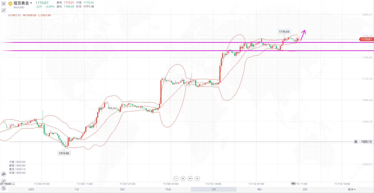 黄金价格周一延续上周涨势,价格按照预期最高触及1775一线。日线级别,布林带持续开口向上,价格受到上轨支撑连续收阳,短线价格走势明显,早间开盘小幅上涨,日内有进一步走高的趋势,而昨日开盘跳空的位置,也就是1765一线则成了日内需要重点关注的支撑位置。4小时,布林带开口,价格回踩中轨附近后延续上涨,整个价格运行于上升趋势线之上,短线价格走势强势,预期短线价格的回调力度不会太大,小幅回踩确认后会再度走高,日内操作思路上以回调做多为主。
